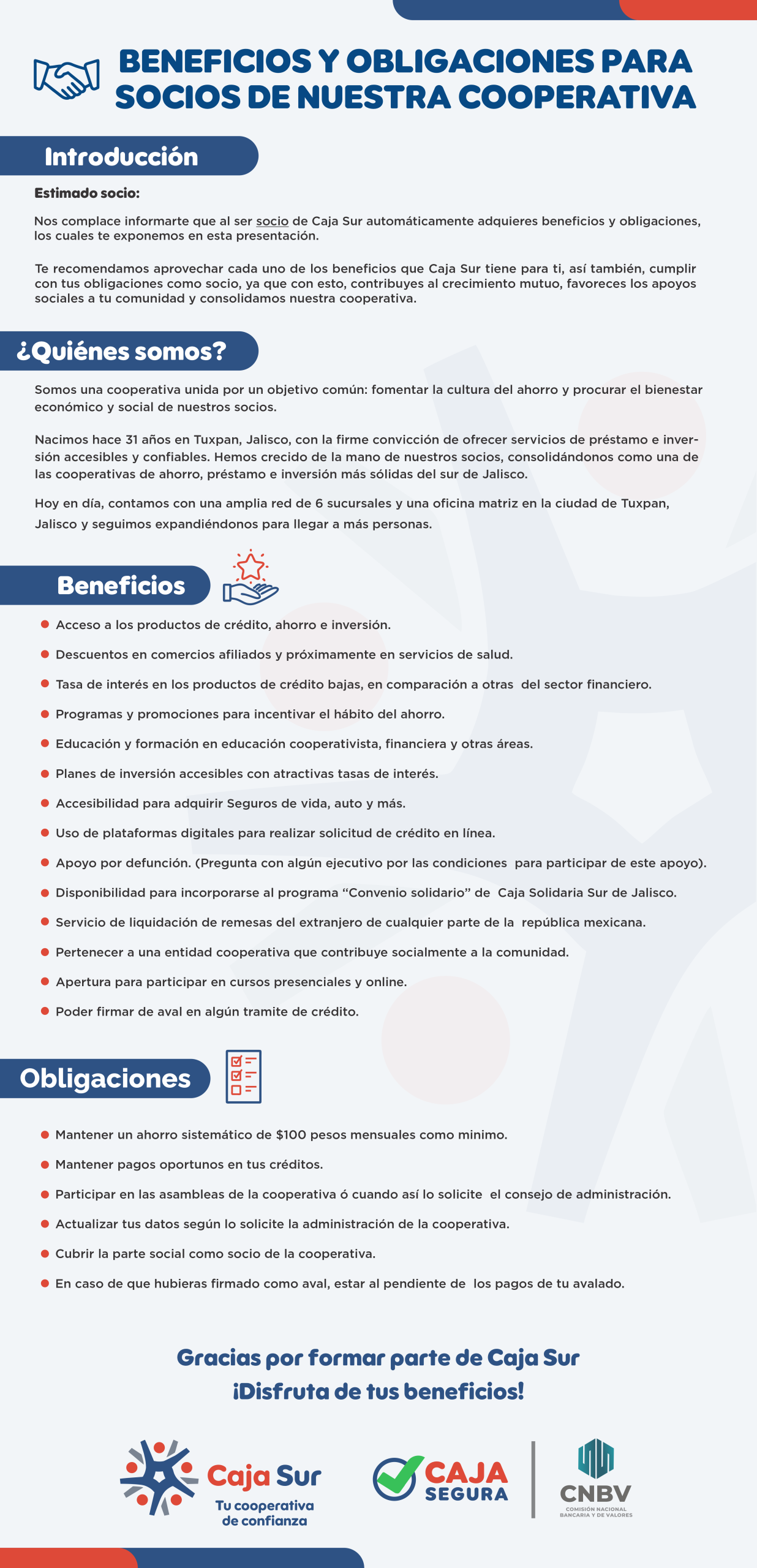BENEFICIOS Y OBLIGACIONES PARA NUESTROS SOCIOS Al ser socio de nuestra cooperativa adquieres beneficios y obligaciones, conócelas y disfruta de ellas.